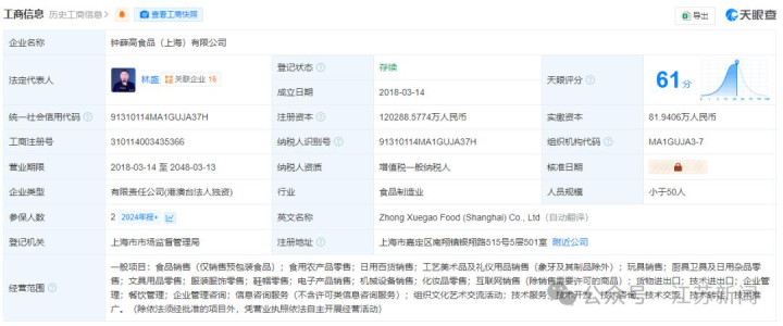 钟薛高食品(上海)有限公司成立于2018年3月,法定代表人为林盛,注册资本约12.03亿元人民币,经营范围含食品销售、食用农产品零售、日用百货销售、工艺美术品及礼仪用品销售、互联网销售、餐饮管理、企业管理咨询等,由GloryseedHKLimited全资持股。